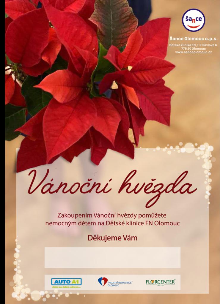 „Kupte si vánoční hvězdu a celé Vánoce Vás bude hřát pocit, že jste pomohli těžce nemocným dětem“, je motto charitativní sbírky, kterou organizuje Šance Olomouc o.p.s. Již dvacet čtyři let prodávají vánoční květinu rodiny léčených dětí, zdravotní personál, členové a přátelé Šance, ale především dobrovolníci, aby pomohli těžce nemocným dětem, které se léčí na Dětské klinice Fakultní nemocnice v Olomouci.